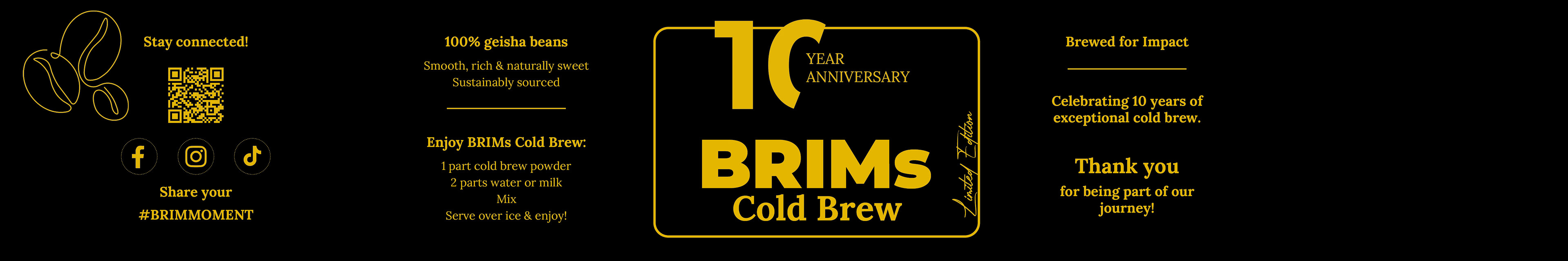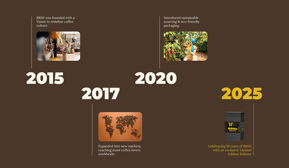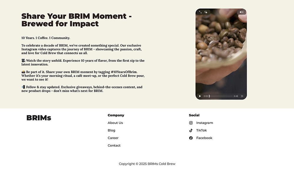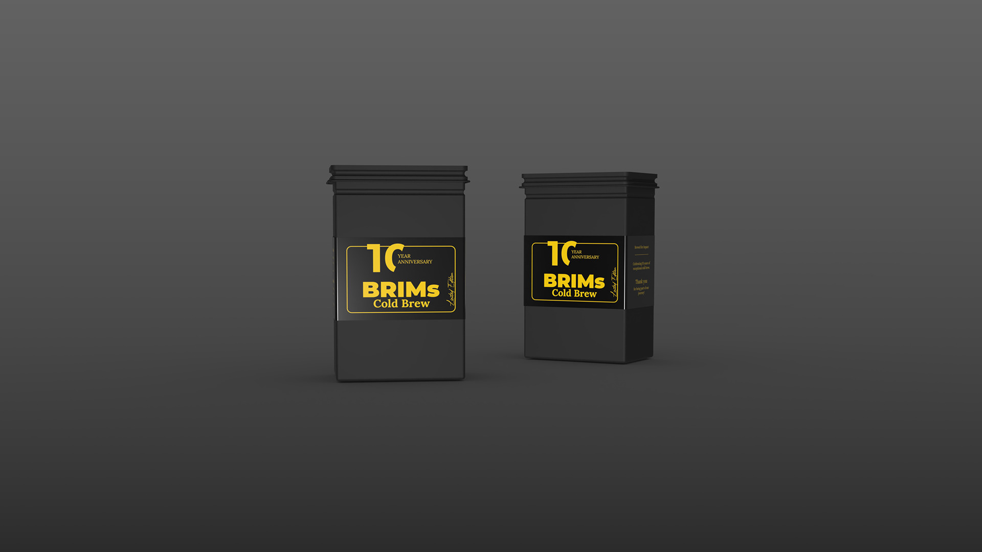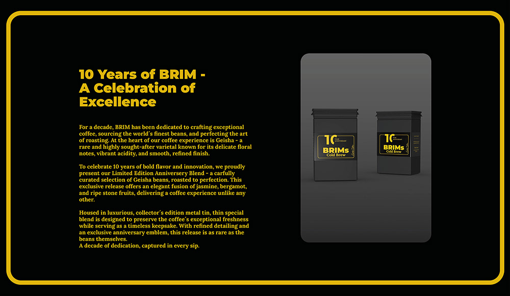 BRIMs Cold Brew ist ein konzeptionelles Markenprojekt, das im Rahmen eines universitären Entwurfs entstanden ist. Ziel des Projekts war die Gestaltung einer Verpackung zum zehnjährigen Jubiläum einer fiktiven Cold-Brew-Marke. Die Jubiläumsedition wurde als eigenständiges, reduziertes Objekt konzipiert, das sich klar vom regulären Produkt abhebt und Dauerhaftigkeit sowie Wertigkeit vermittelt.Die Arbeit umfasst die Entwicklung einer typografischen Banderole, ein 3D-Modell der Dose, eine begleitende Landing Page sowie ein Video. Der Fokus lag auf einer klaren visuellen Hierarchie, ruhiger Farbgebung und der Übersetzung eines Jubiläumskonzepts in eine konsistente digitale und physische Gestaltung.